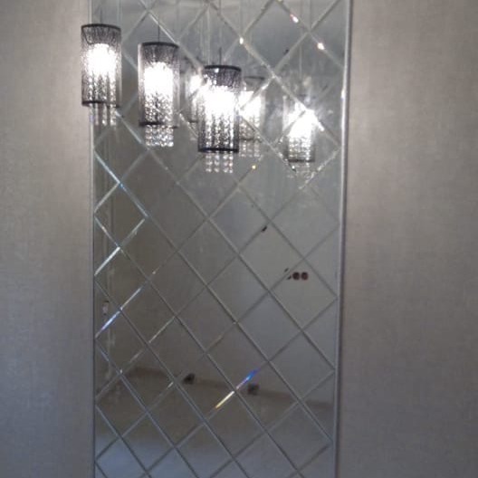 Использовалась серебристая зеркальная плитка формы "вытянутый ромб".