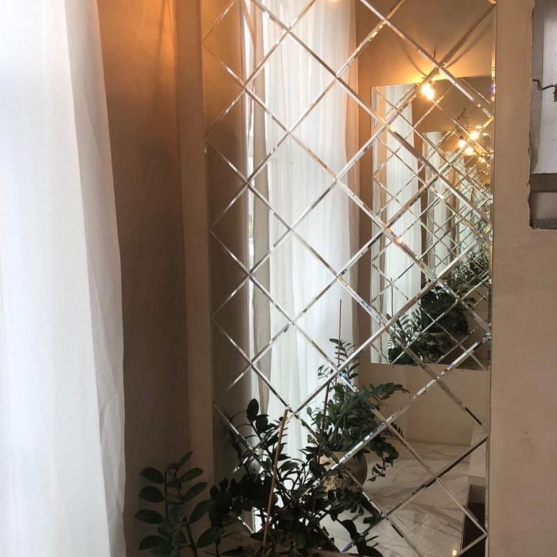 Использовалась серебристая зеркальная плитка формы "вытянутый ромб".